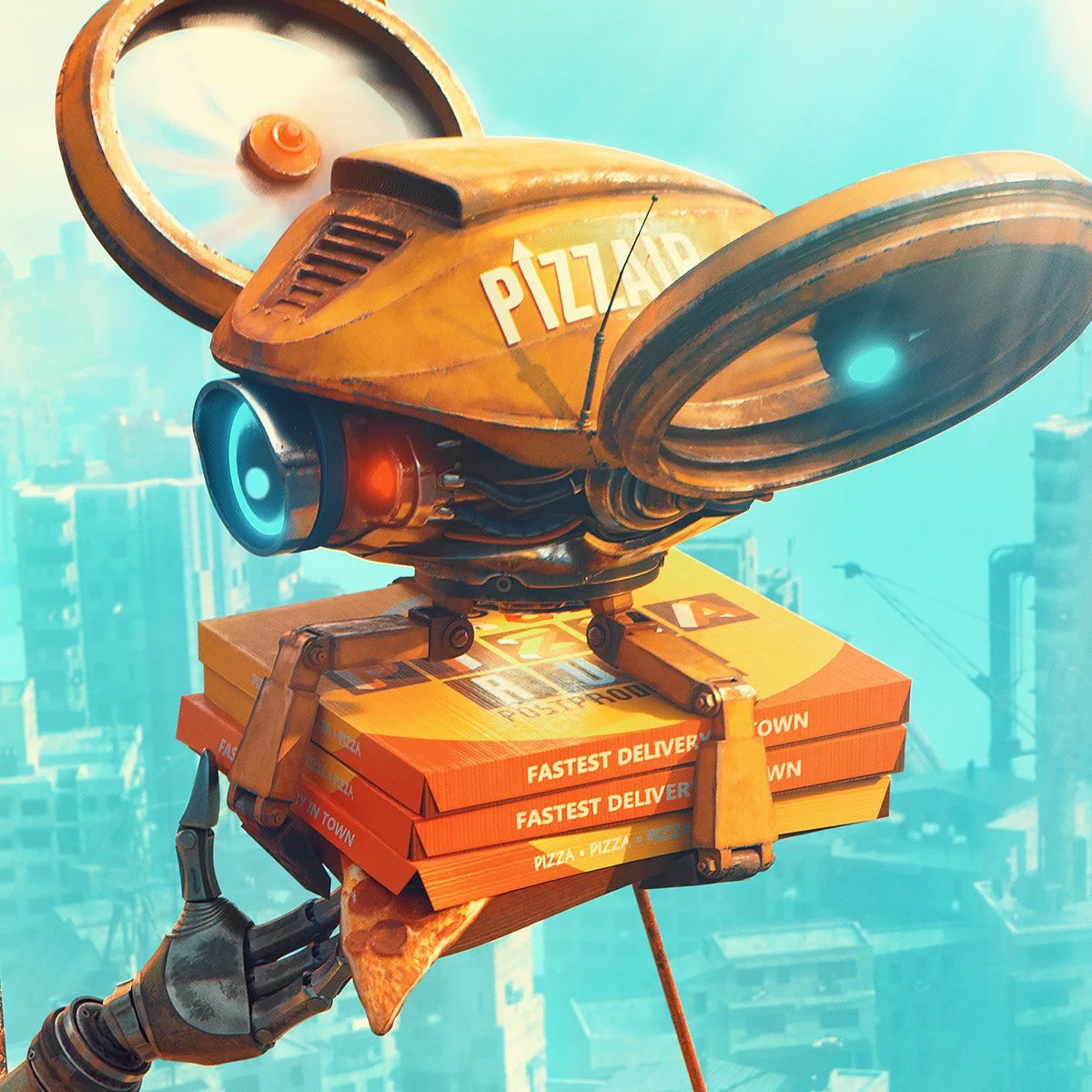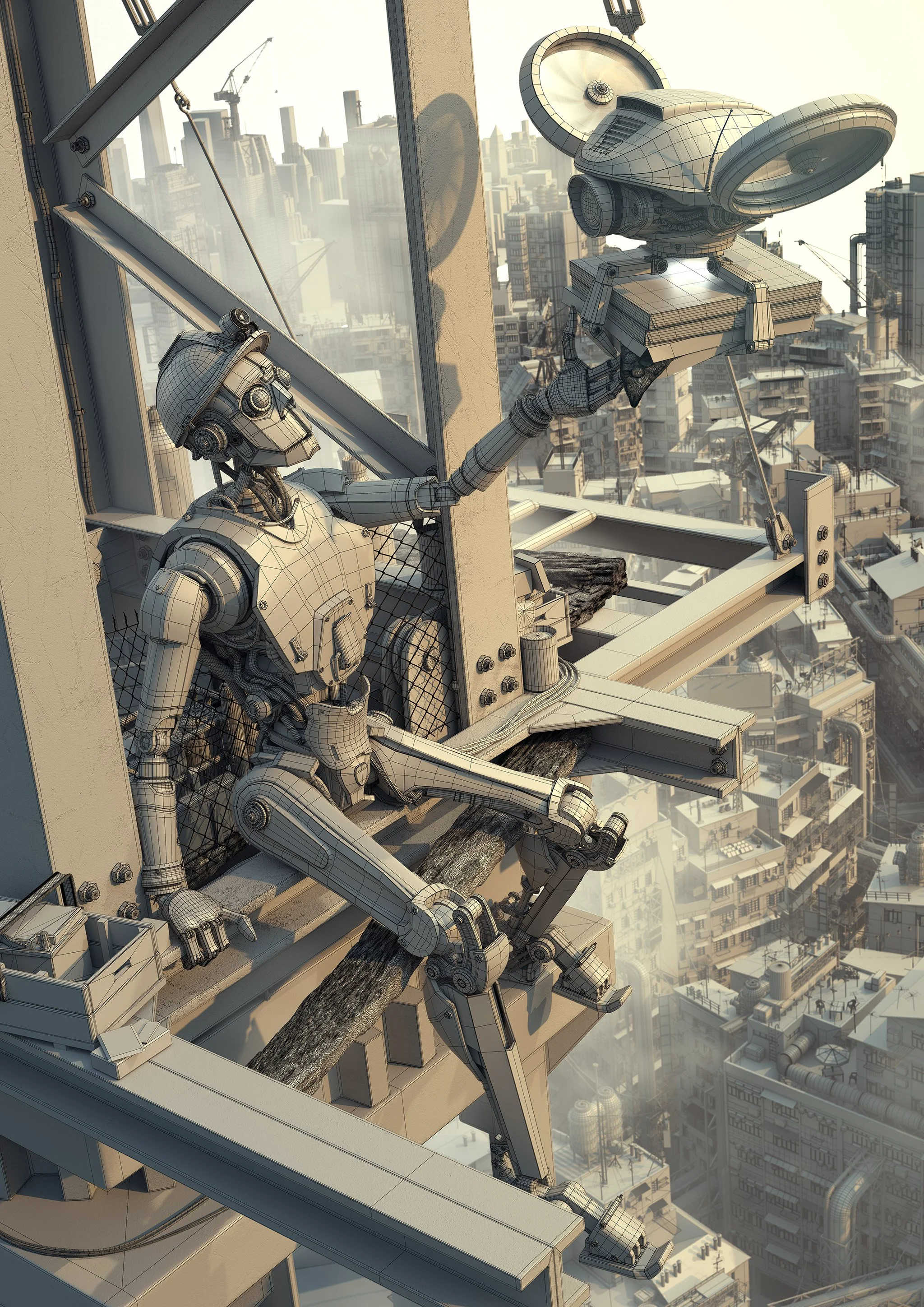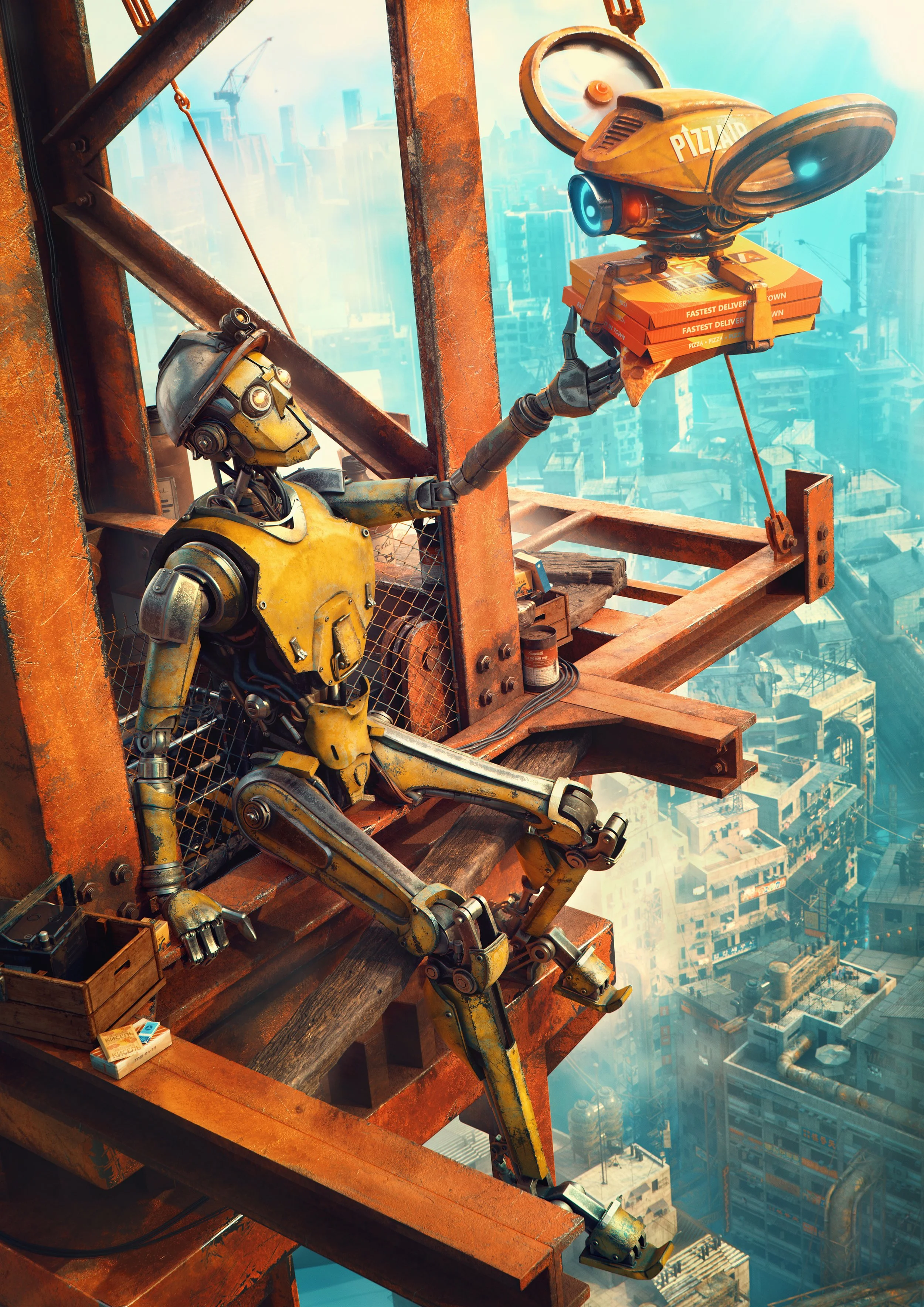 Sometimes even the hardest-working construction bots need a moment to recharge. Set high above a sprawling cyber-metropolis, this piece captures a quiet break in the day: a lone worker robot receiving a piping hot delivery from a buzzing pizza drone.